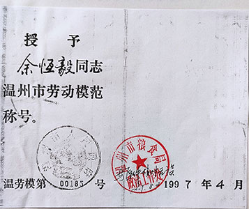 余恒毅于1995年被評為市糧食系統(tǒng)優(yōu)秀共產(chǎn)黨員,1996年榮獲溫州市優(yōu)秀共產(chǎn)黨員稱號,榮獲1997年溫州市勞動模范稱號,榮獲1999年浙江省糧食系統(tǒng)勞動模范。在榮譽(yù)的背后,是余恒毅在溫州市糧食系統(tǒng)四十九年的奮斗歷程,是在溫州面粉有限公司三十七年的默默耕耘。自他將一生的信念書寫于黨旗下,他就把一輩子最靚麗的青春都留在了麥堆上。