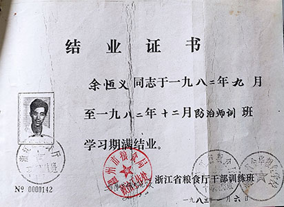 余恒毅于1972至1986年任職溫州市糧食倉庫與第二糧庫保管員和防化員,十四年基層摸索,積極參與專業(yè)培訓(xùn)練就一身扎實的管糧基本功。在其位便謀其新篇,當(dāng)保管員就立足扎根糧倉的經(jīng)驗探索管糧新思路,經(jīng)過反復(fù)嘗試在1986年成功試驗一種緩釋法熏蒸,彌補(bǔ)歷年來我市糧食熏蒸普遍采用常規(guī)法的不足,尚屬溫州市首創(chuàng)。